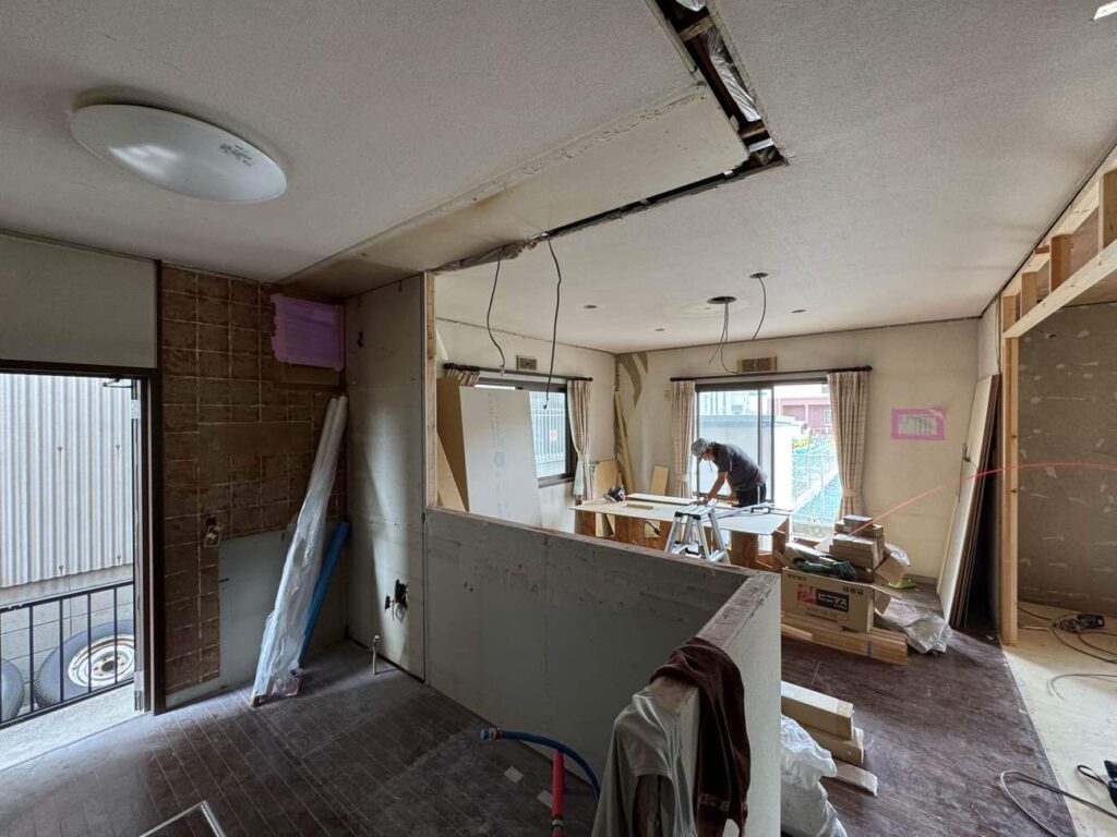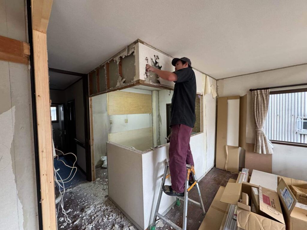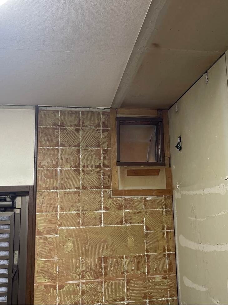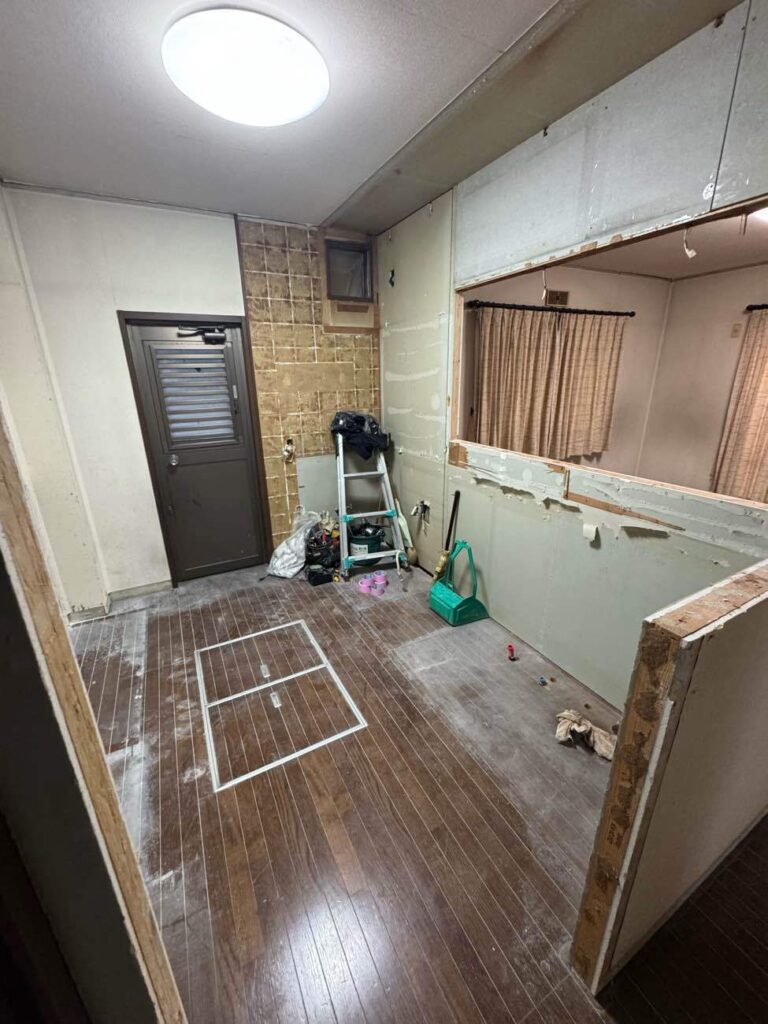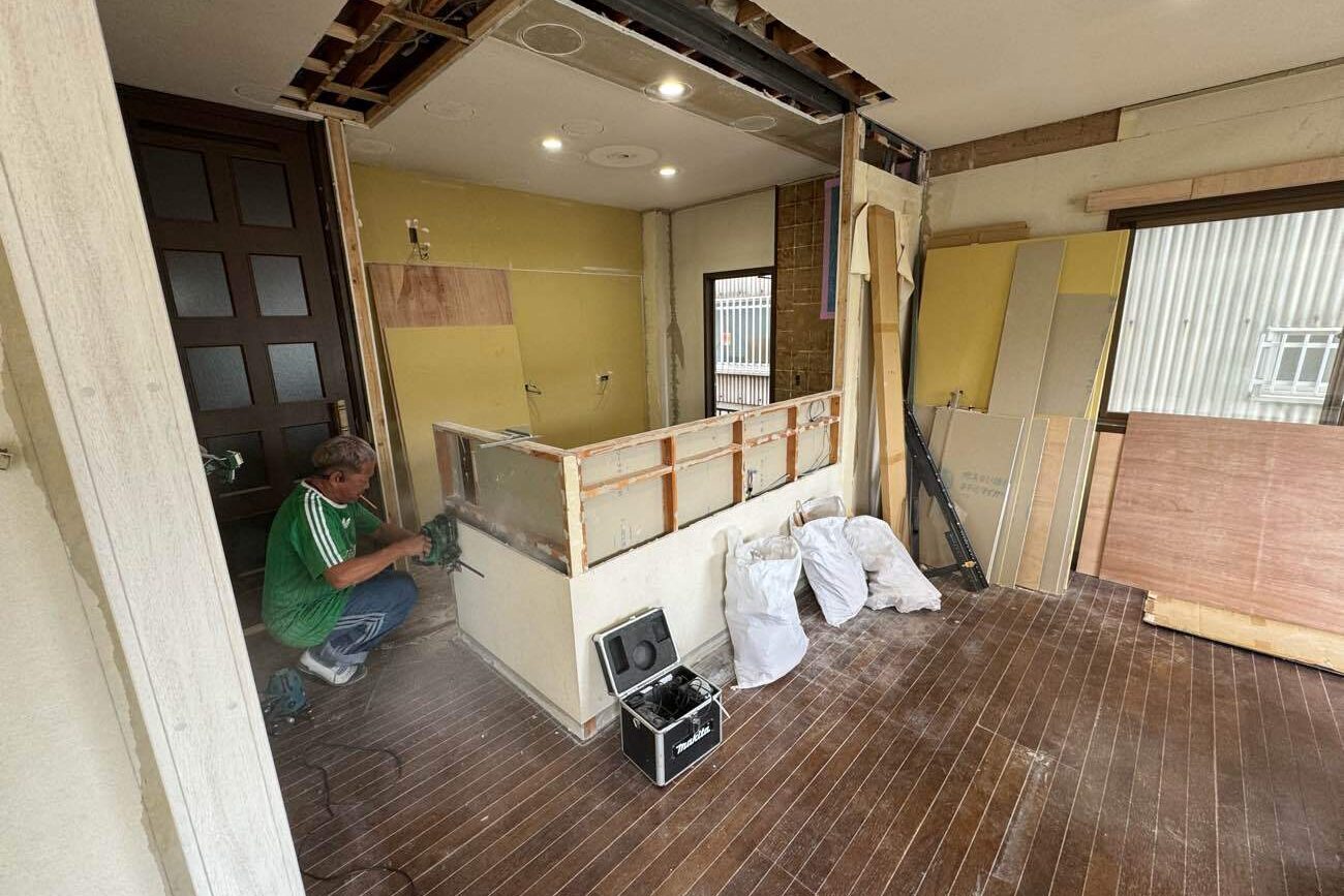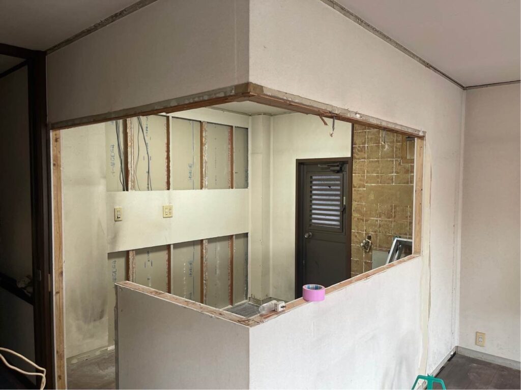 キッチンの暗さと圧迫感を改善するため、壁の一部を撤去して空間を広げていきます。