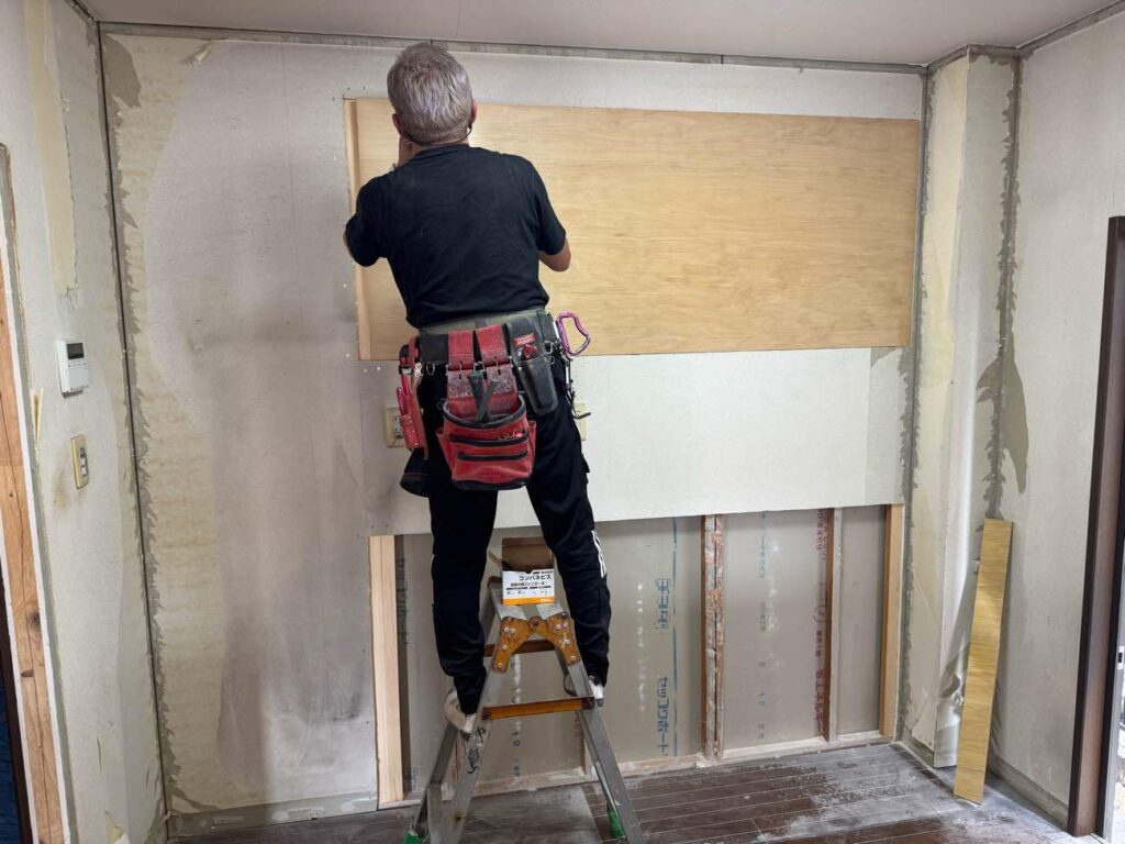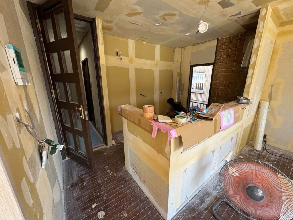 カップボードを外したあとの壁も、きれいに平らに仕上げていきます。
