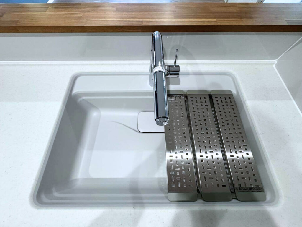 シンクは滑らかな形状と隙間をなくし、汚れがたまる場所をなくしています。