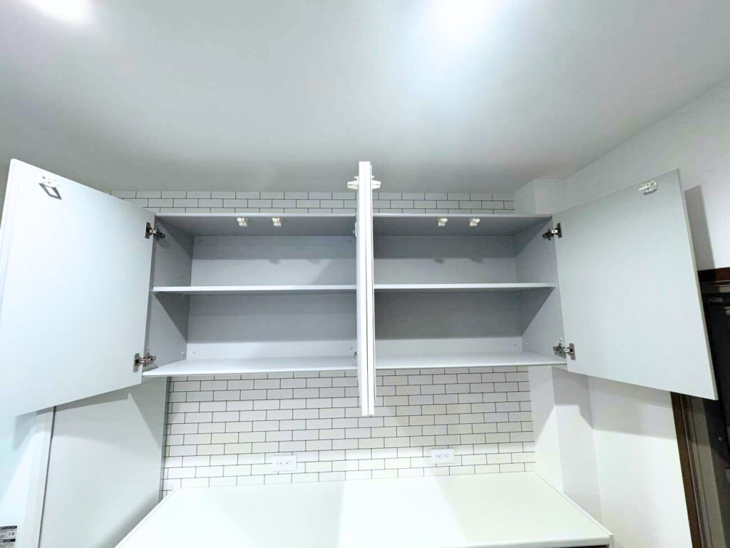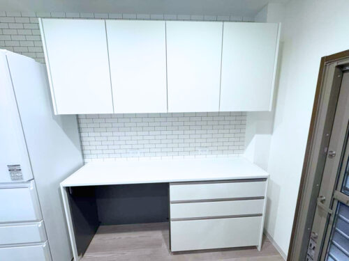上部の収納はなくなりましたが、システムキッチンとカップボードにたっぷり収納を確保し、使いやすさもアップしています。