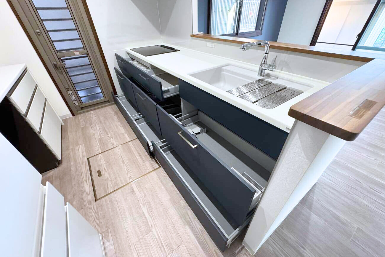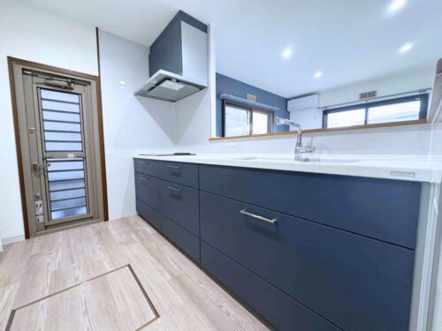 また、落ち着いた青のユニットキッチンがさし色となり、空間を引き締めるアクセントになっていますね。