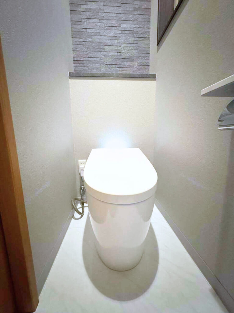 ホワイトを基調とした明るい空間に、背面のシックなタイルが映える、スタイリッシュなトイレに仕上がりました。