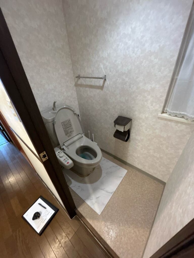 トイレには上部に収納を設置し、タカラのトイレパネルを採用。