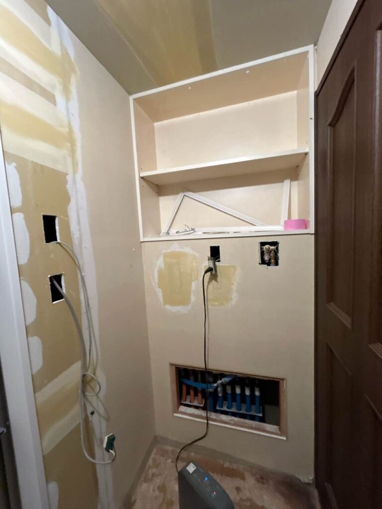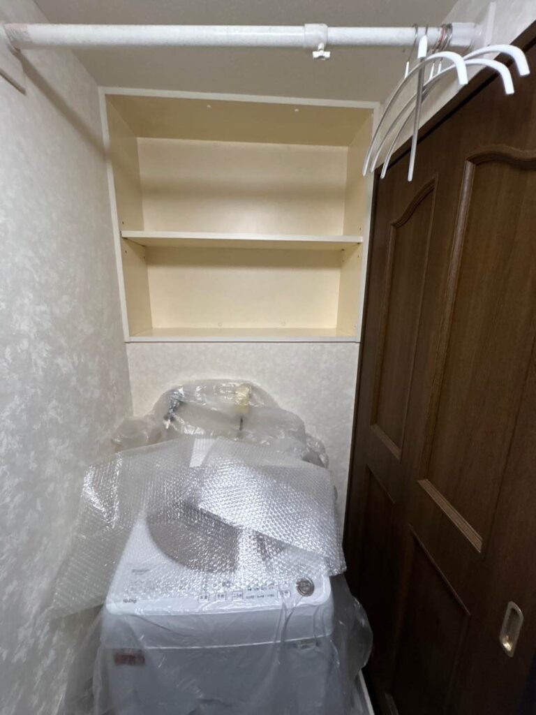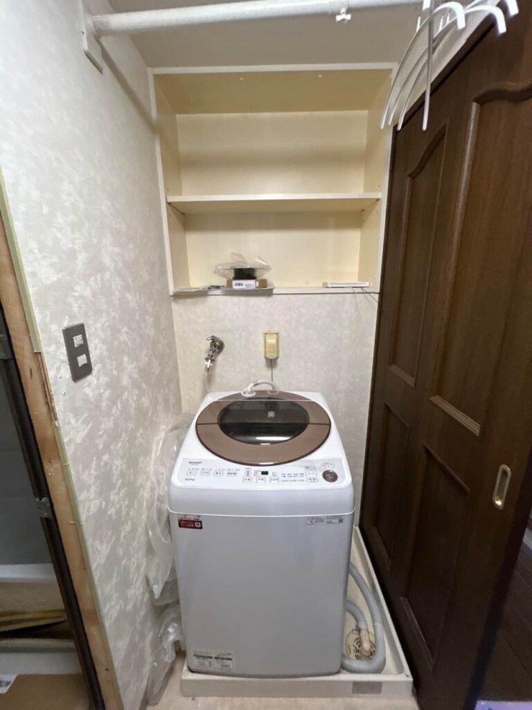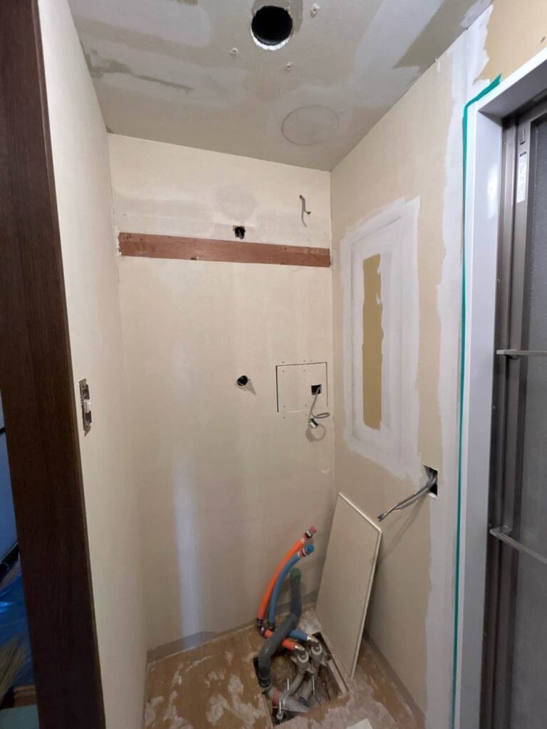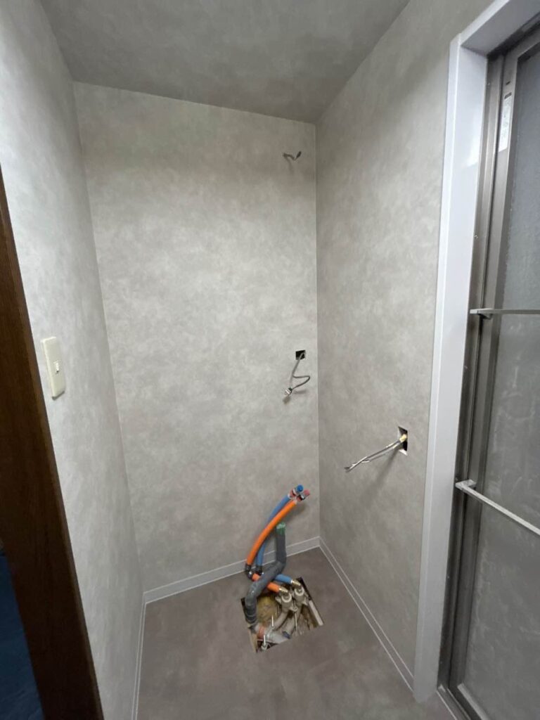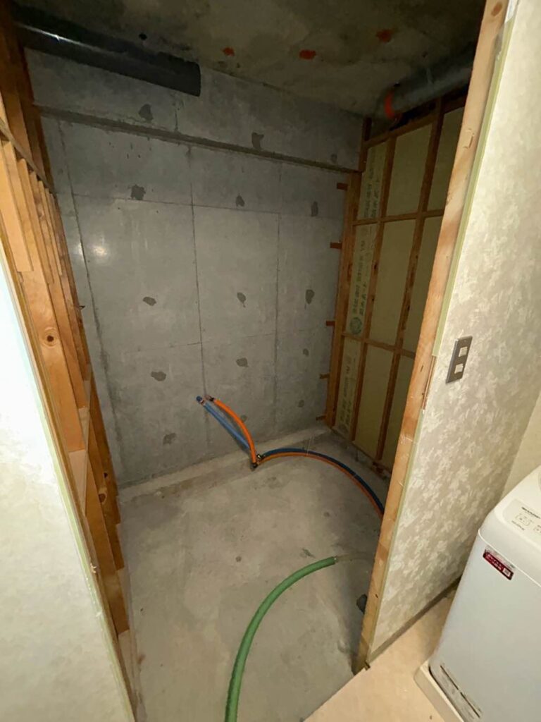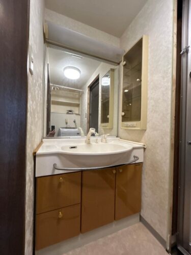 洗面化粧台の左ににあった収納は撤去し、すっきりした空間にしていきます。