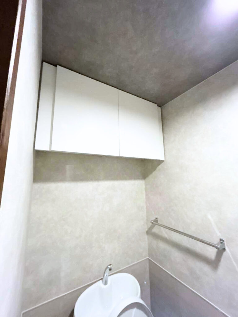トイレには新たに上部収納を設け、汚れやすい壁部分にホーローのパネルを採用して使い勝手が向上しました。