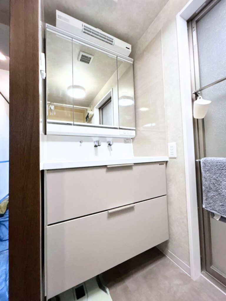 機能面も大きく向上しています。 洗面化粧台の隣にあった収納は撤去し、収納力の高い洗面化粧台を採用。