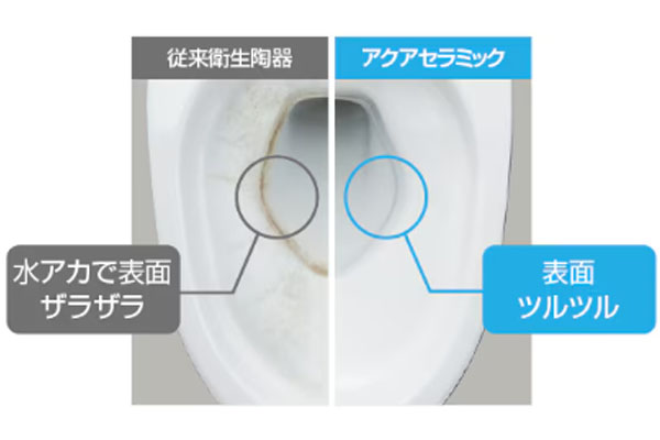 表面がツルツルしており、汚れが付着しにくい「アクアセラミック」素材。便器に汚れが付きにくく、付着した汚れもサッと落とせる設計です。