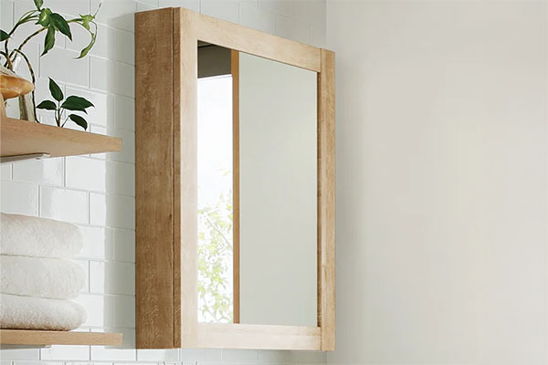 まるでインテリアのような一面鏡。木のぬくもりも感じられる鏡の裏は収納スペースになっています。デザイン性が高いだけでなく、機能性も兼ね備えた鏡です。
