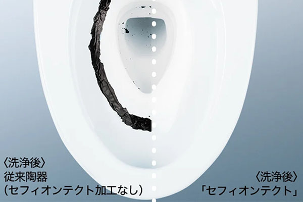 ナノレベルになめらかで汚れにくい「セフィオンテクト」素材を使用したピュアレストEX。付着した汚れも落ちやすい素材でできた便器です。